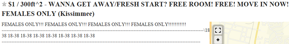 The housing section of Craigslist is one of my favorite guilty pleasures. I browse through houses and apartments, daydreaming over where I could end up once my current lease ends. I drool over $2k/month downtown loft spaces that I could afford 7-12 jobs from now. But as of late, my favorite part of Craigslist housing is combing through the dirtiest of its laundry by searching for “FWB”. This produces a generally small but horrifying sample of generous, kind-hearted gentlemen looking to trade rent and/or other living expenses in their homes for- you guessed it!- sex. What follows is what I believe to be THE Quintessential 2015 Looking For Live-In Blowup Doll In Exchange For Almost-Free Rent Craigslist Post.
