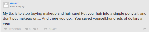 20%: “my tip for saving on makeup and hair products is to stop wearing makeup and stop doing your hair and just put it in a ponytail all the time and u could save hundreds of dollars a year like me :)”