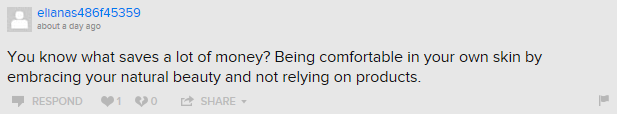 Hey, Eliana! Another good way to save a lot of money is to terminate your internet service because it makes it waaaay to easy for you to display your wet-blanket condescension in a public forum. The fun thing about makeup is that wearing it doesn’t mean you don’t think you’re pretty.